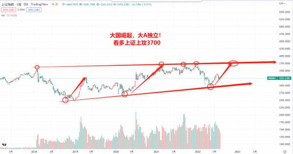 美國經濟步入衰退期。一方面,美國貿易“逆全球化”加劇物價上漲壓力;另一方面,疫情以來的美聯儲貨幣超發加速“工資-通脹”螺旋,美國物價持續上漲,美聯儲不得不採取加息+縮表的政策,導致美國經濟衰退進程超預期。美國老百姓當初享受“直升機撒錢”帶來的消費刺激有多爽BG大遊,接下來要面對的經濟下行壓力就可能有多慘。兩相對比,不難預計將有更多國際資本持續湧入A股市場,做多中國!展望2022下半年,頂點財經柯友浪看多國運交鋒中上美下帶來的大A獨立行情,第一目標位上攻3700點,衝擊中美博弈以來的區間上沿!